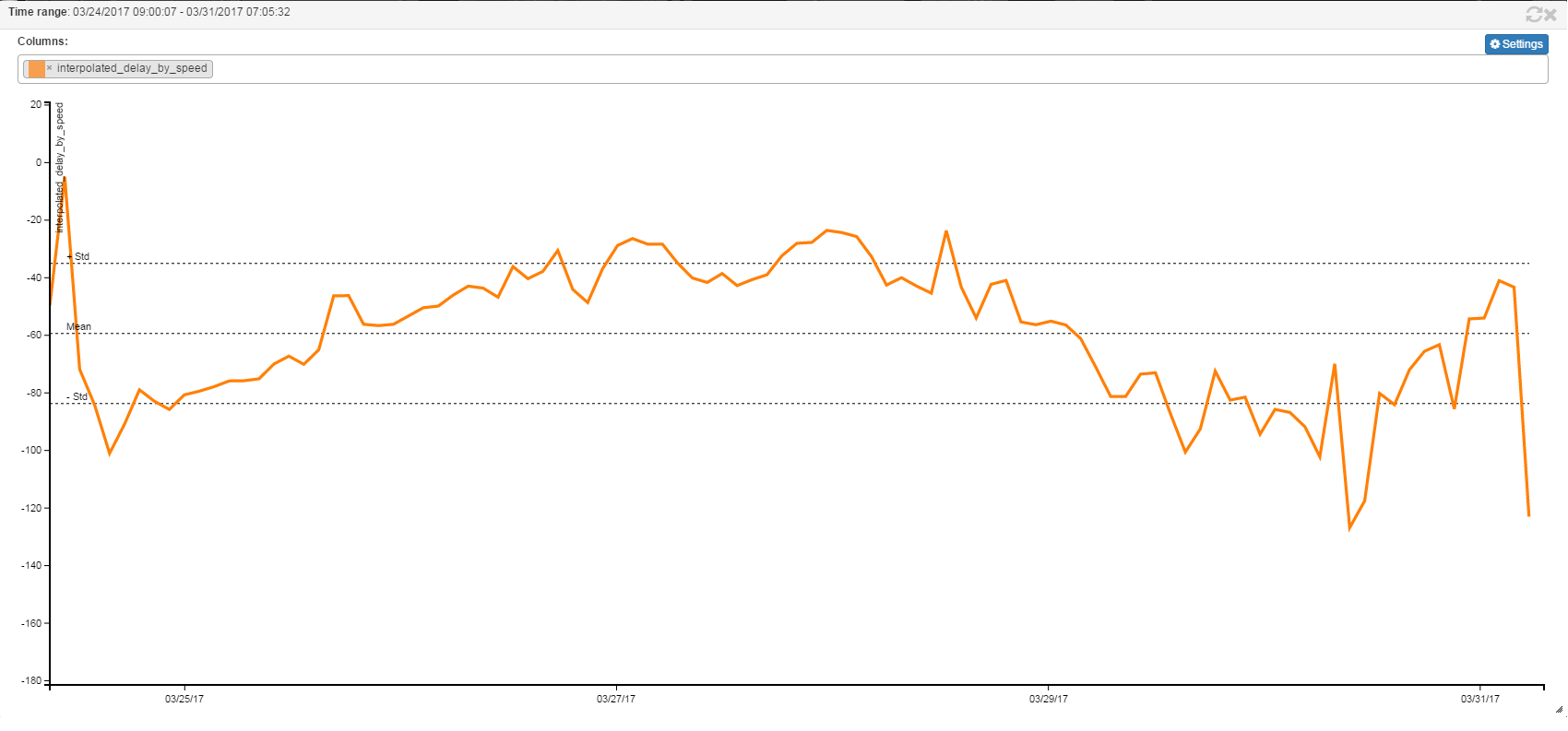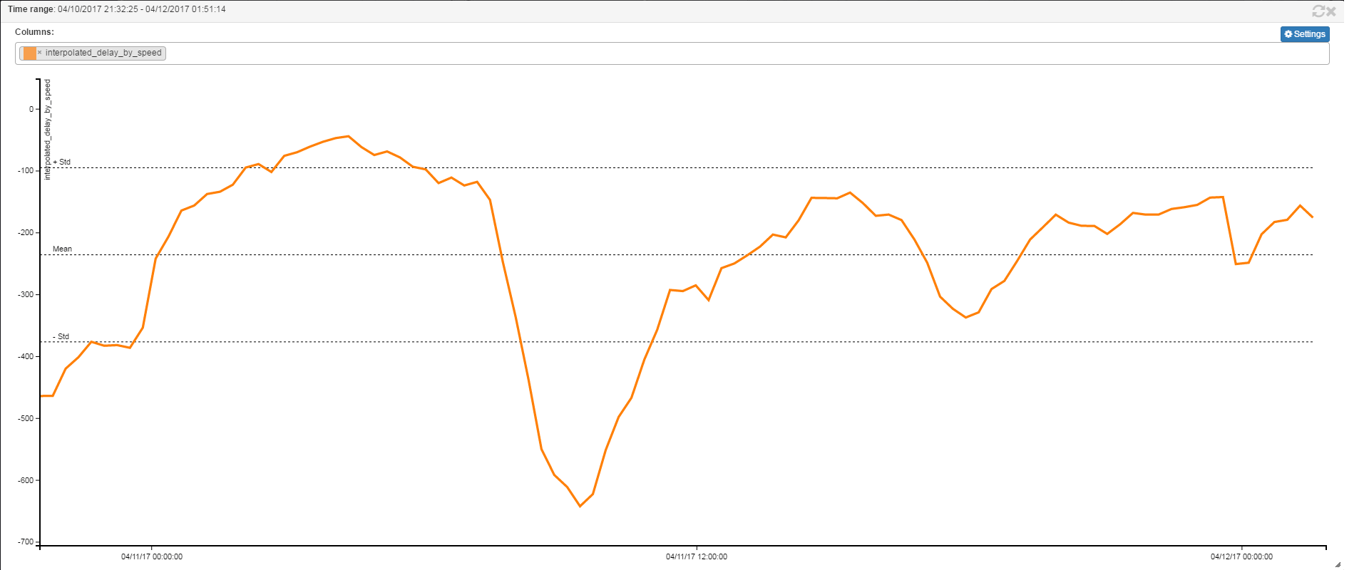 You can zoom in on the graph to look at a time period in detail. The above graph shows how the delay for all buses changes during the day.